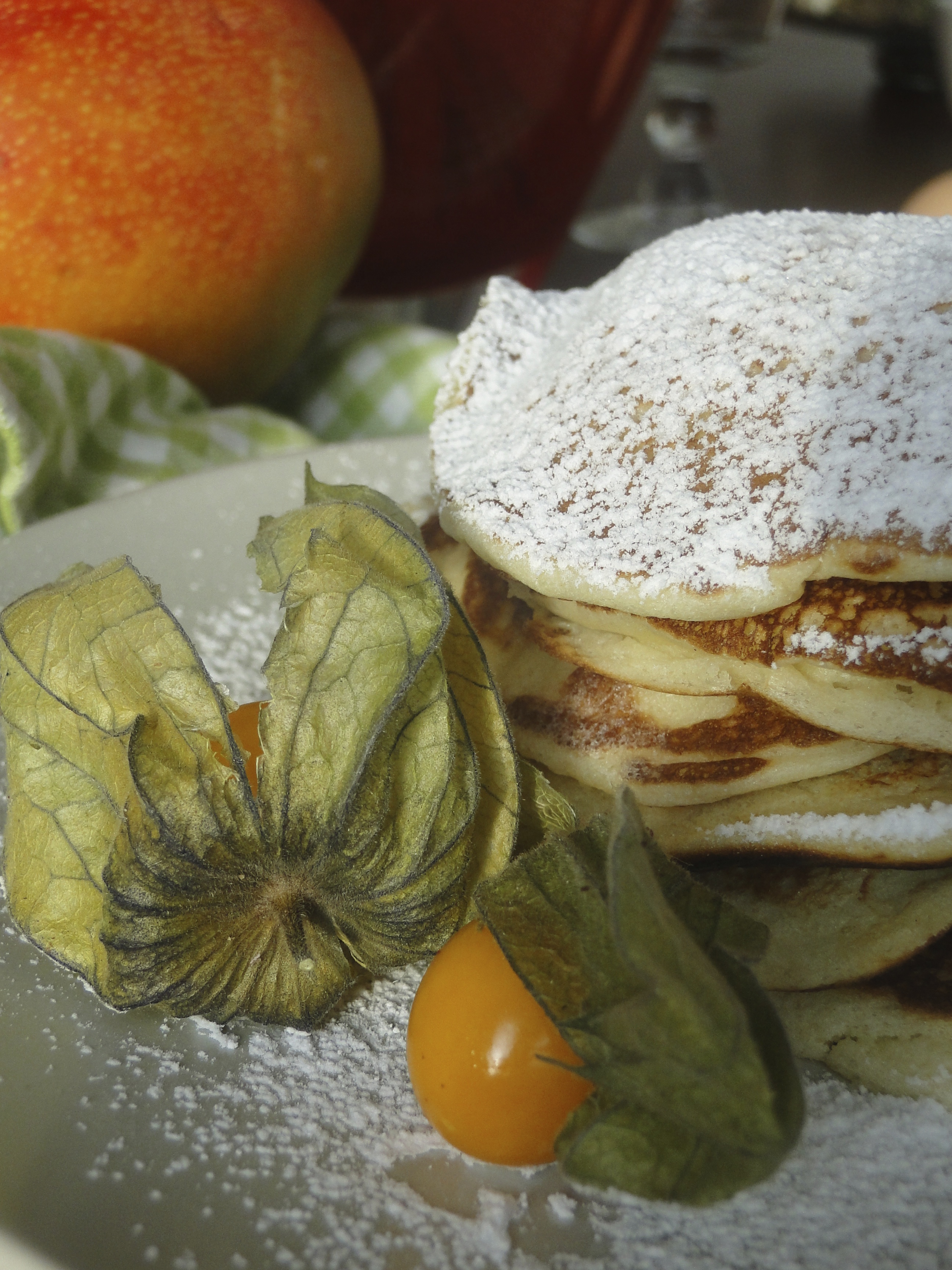 Mix all ingredients except egg whites together – if you have a little more time, start by beating the whole eggs with the sugar until they have a foamy texture and bright yellow color. Last add the egg whites that should be really stiffly beaten. Bake pancakes in a hot frying pan, my pan holds batches of three. Keep pancakes warm in the oven and powder with confectioners´sugar before serving.