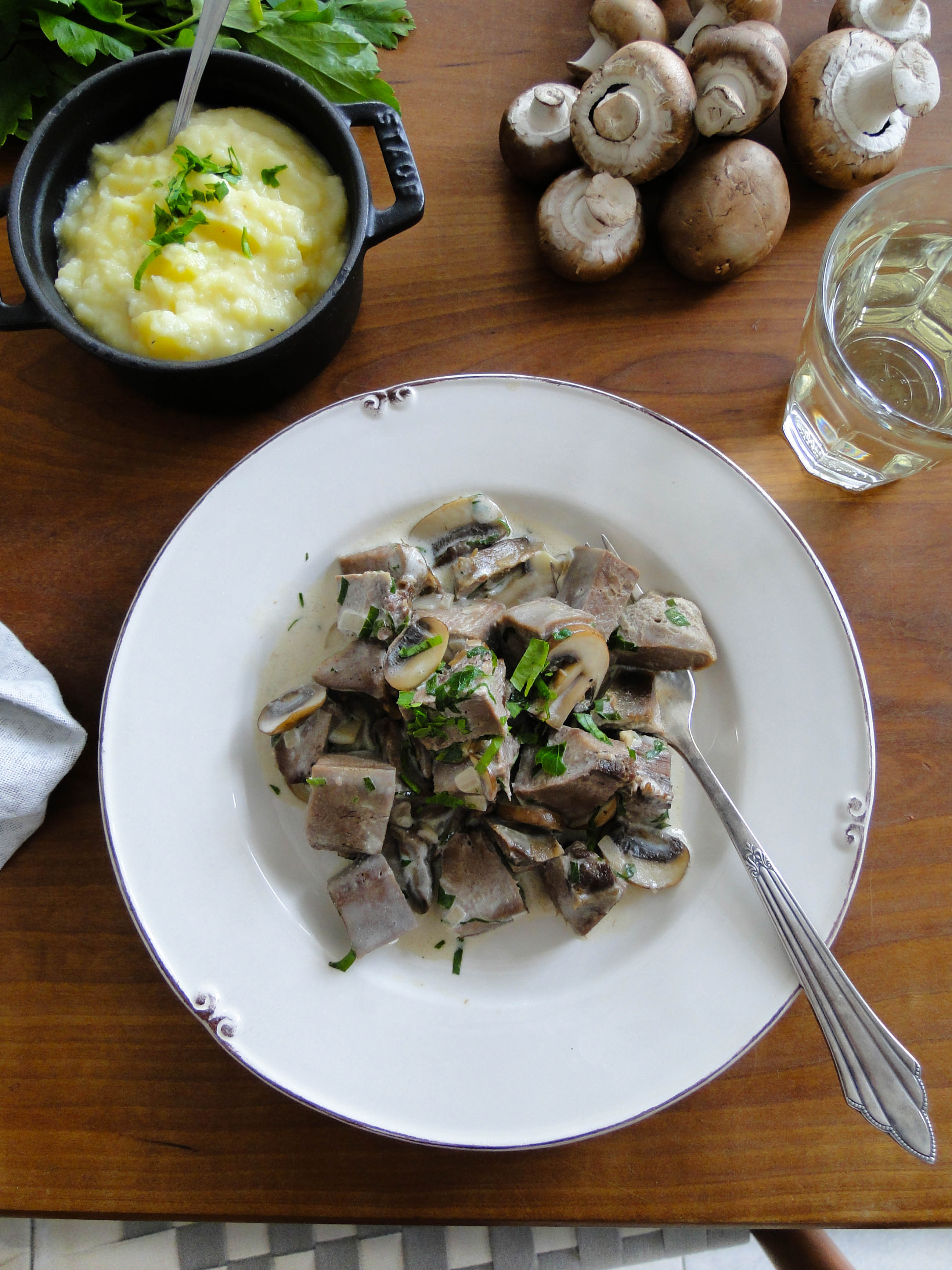 In a saucepan, fry chopped shallot and sliced mushrooms in 1 tbsp butter until slightly browned, about 5 minutes (medium to high heat). Dust with a little flour, increase the heat to high, add wine and reduce to about halved volume. Reduce the heat to low, add broth, cream, herbs and tongue, and allow to simmer for 10 minutes. Add more broth if necessary. Adjust seasoning and serve with mashed potatoes.