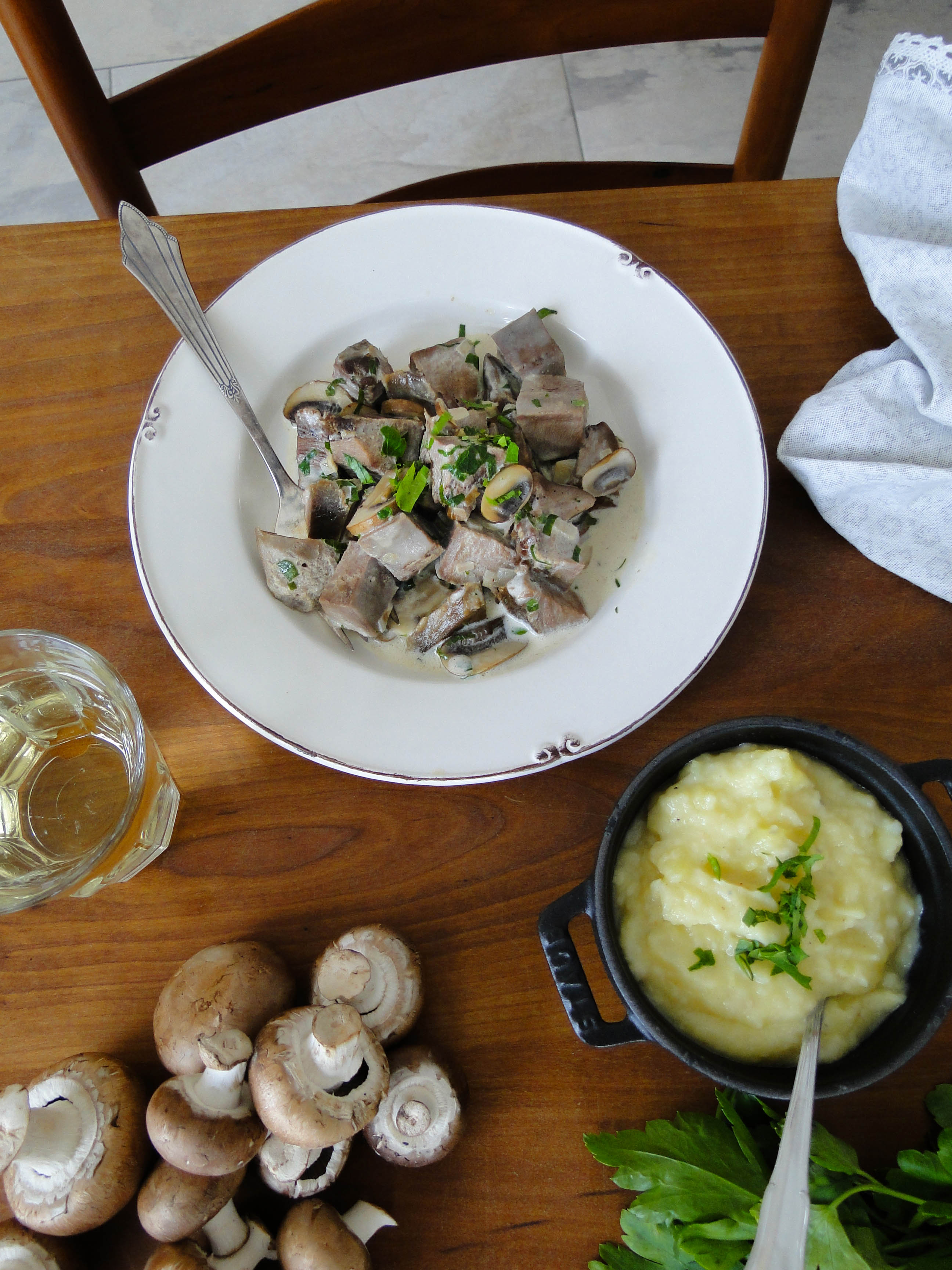 Recently, it was the pork tongue that caught my eye. Instantly, I pictured the dish my mother made when I was a child: Tender chunks of tongue swimming in a pool of creamy white sauce alongside champignon mushrooms and small green dots of chopped parsley. If you haven´t tasted pork tongue, you´d probably be surprised how tender it is. I remember spying enviously on my brother´s plate, suspecting him to have been served with the best parts.