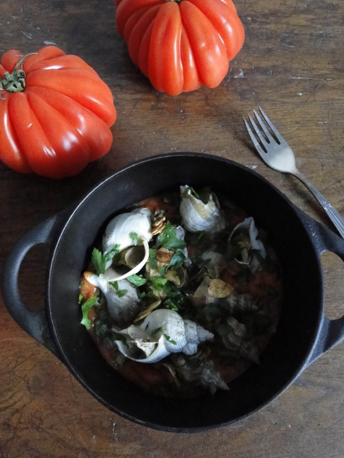 Facing that little snail challenge I was obviously up to, I was even happier to have the mussels up my sleeve. They were my safe harbor, one of our favorite meals and always a hit. Not only very delicious, but fun to eat – you can use an empty shell as a fork to pick the mussels, and even better squeeze each other´s noses with them. Needless to say my son loves that! To make up for the supposedly unwelcome snails, I paired them with as much favorites as possible: jambon des Pyrenées (ham), champignons roses and sausage meat (because these pork sausages are one of my latest food crushs) – goodies from land & sea all united in one large steaming pot! As of the bulots: I served them as a starter with a succulent tomato sauce made of the most amazing coeur de boeuf tomatoes that are sold on every corner here. Sprinkled with parsley and crispy garlic chips, I couldn´t think of a better way to make these snails look appetizing and less like…well, snails.