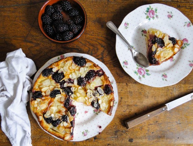 Then I kept looking for the prettiest blackberries I could find, and brought home a few flawless punnets a couple of days ago. The plan was to make not one, but two desserts impossible not to like, thus hopefully suitable for spreading and regaining blackberry love: a rustic blackberry and pear clafoutis, and a light-as-a-feather millefeuille, a` thousand layers` of puff pastry with blackberries and creamy vanilla mascarpone. Both turned out delicious, very easy to make, and most importantly make the blackberries stand out and shine. And while I can´t decide which of the two I prefer – perhaps the clafoutis for breakfast and the millefeuille for lunch? -, I am happy to report that until now, I haven´t heard those blackberry voices again.